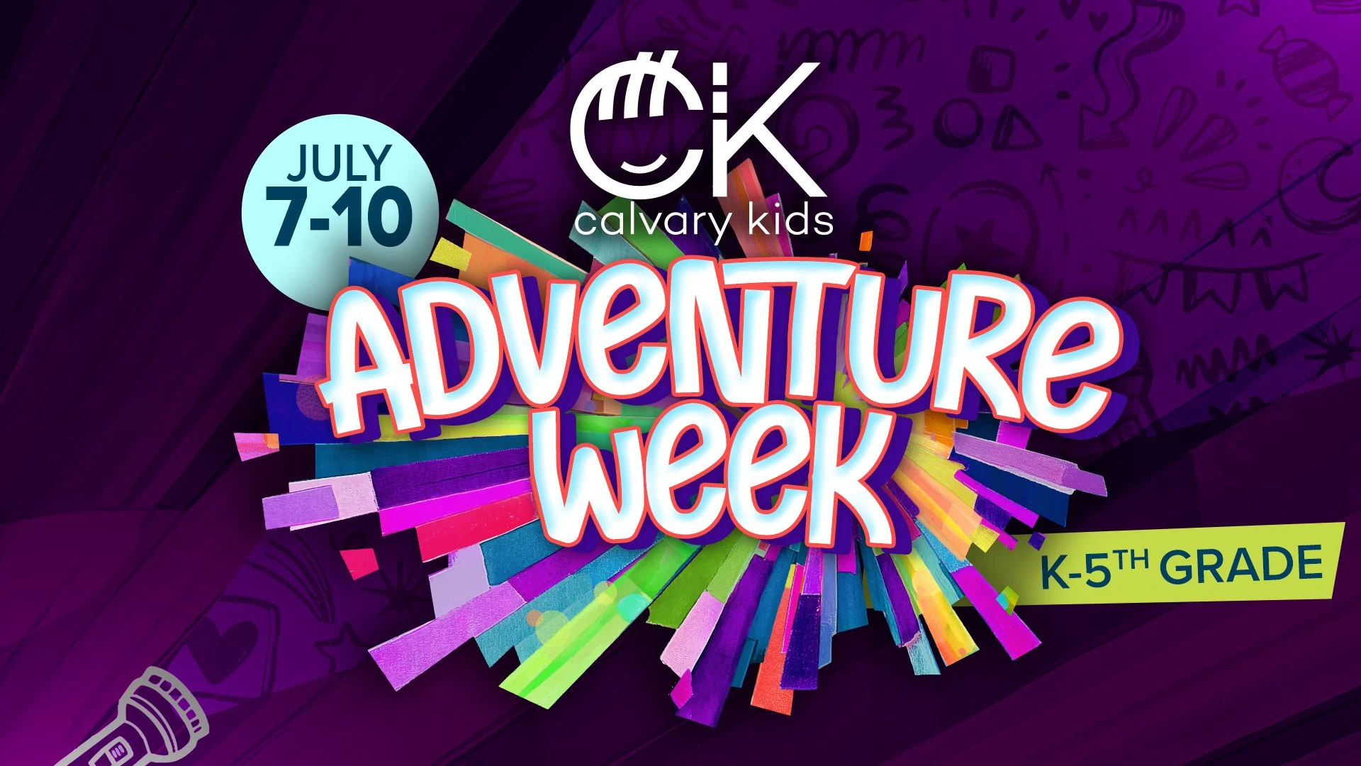 Calvary Kids Week runs from July 7th through 10th, starting each day at 9 am and going until noon. Doors will open at 8:30 each day for check-ins.